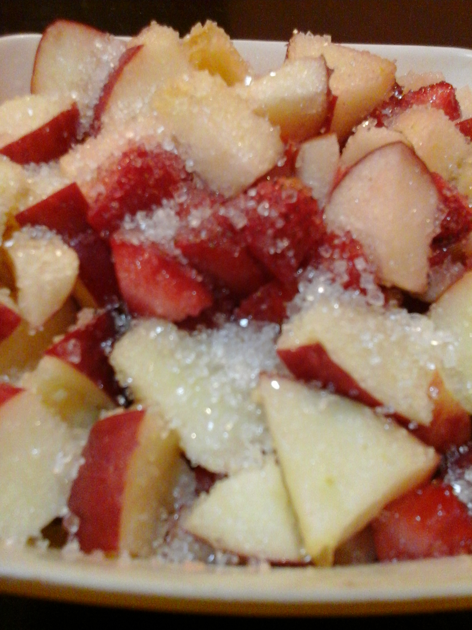 Chop the fruits into pieces. Mix sugar and leave for a while.