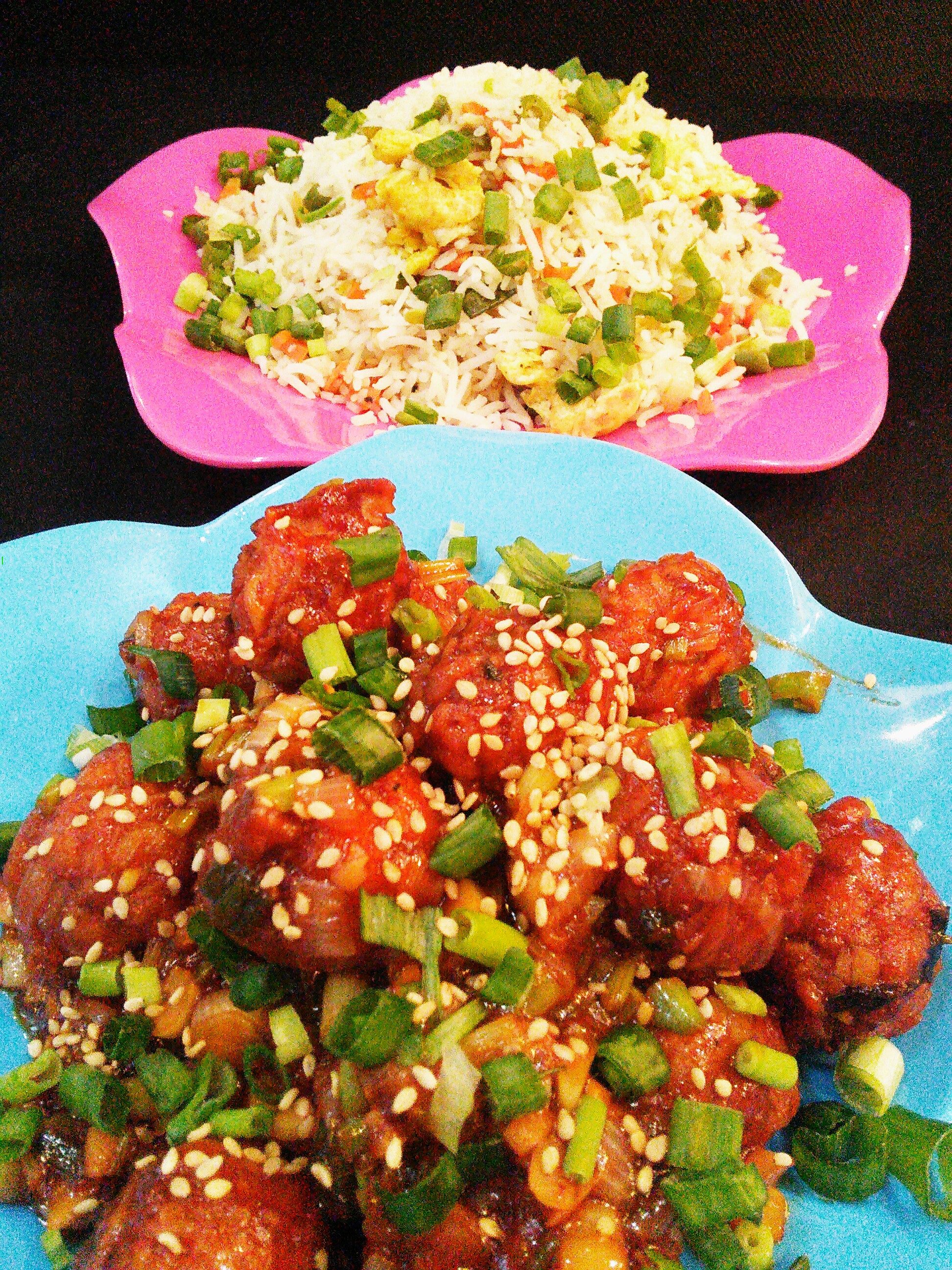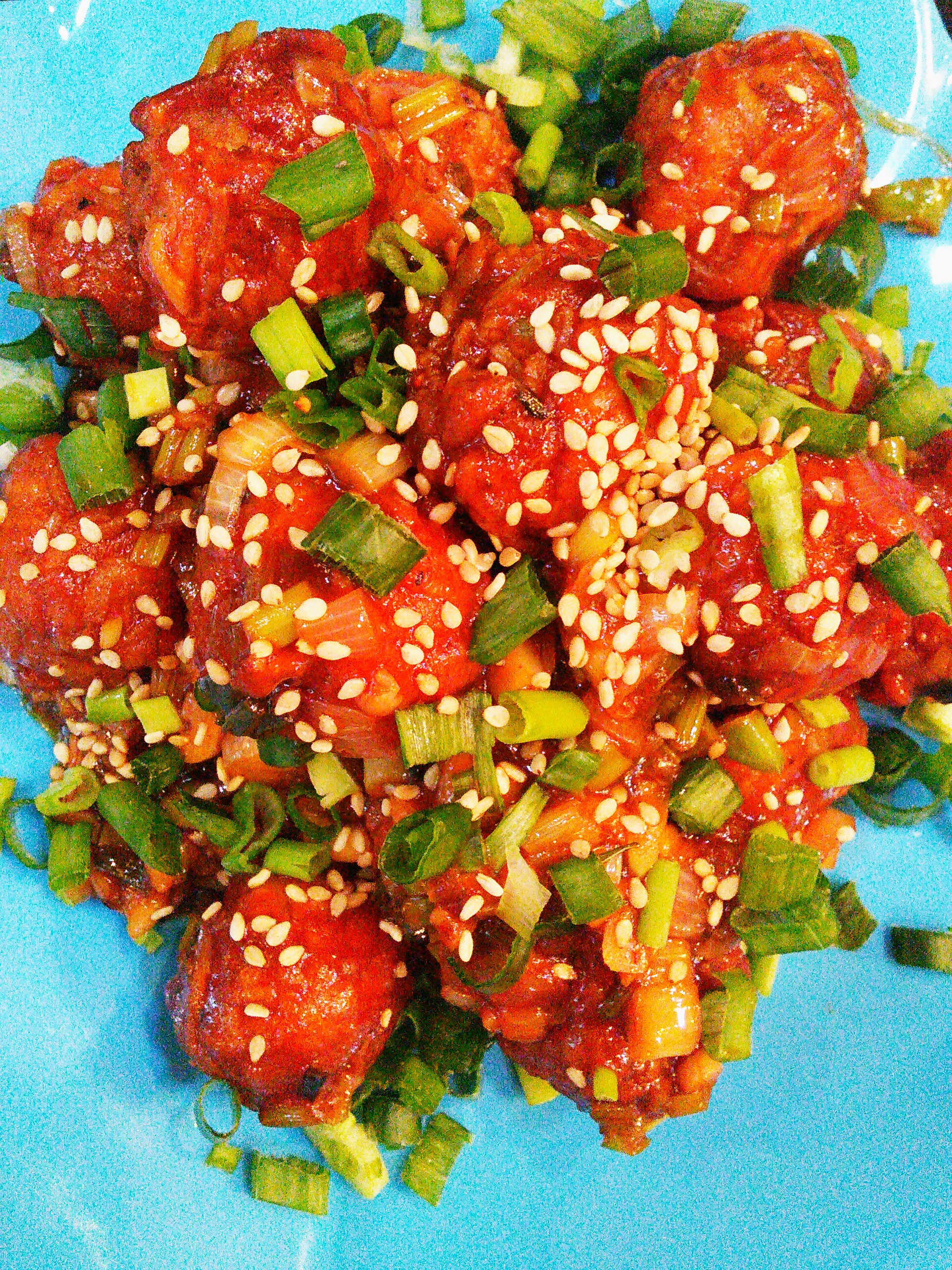 In a wok, put 3 tbsp. of oil and add onions, garlic, chillies, and the remaining sauces one by one. Then add honey. Saute on high heat for a while and add the chicken balls. Take it out in a serving dish and garnish with sesame seeds and spring onion greens.