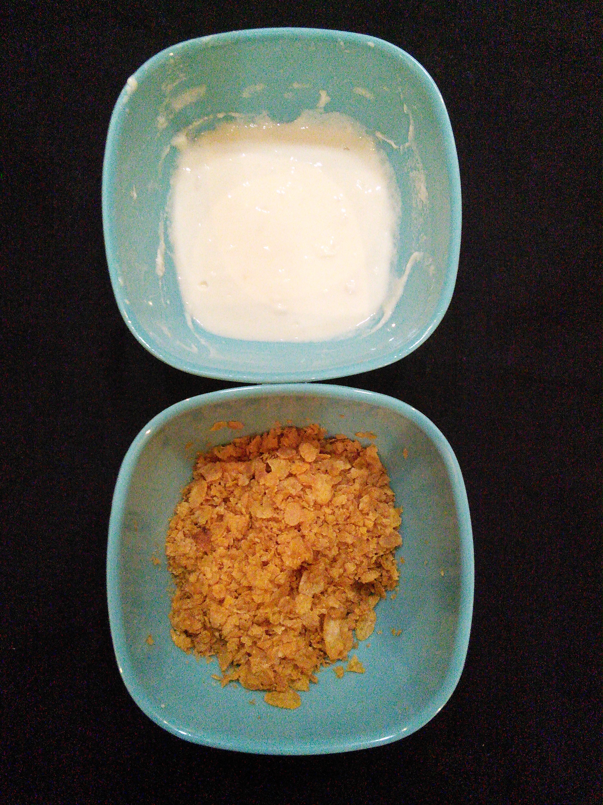 - Crush some cornflakes, plain or flavored. A good idea would be to match the flavor of the cornflakes with the ice cream. I didn’t try that though.