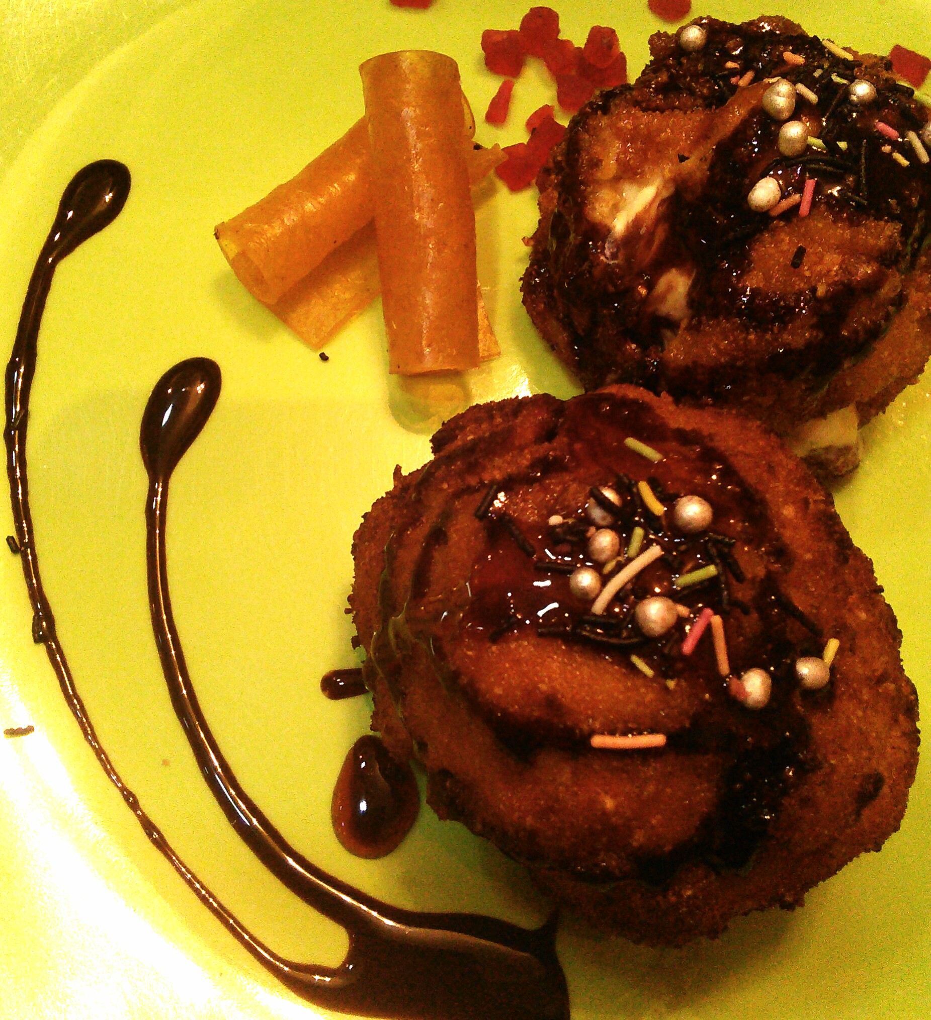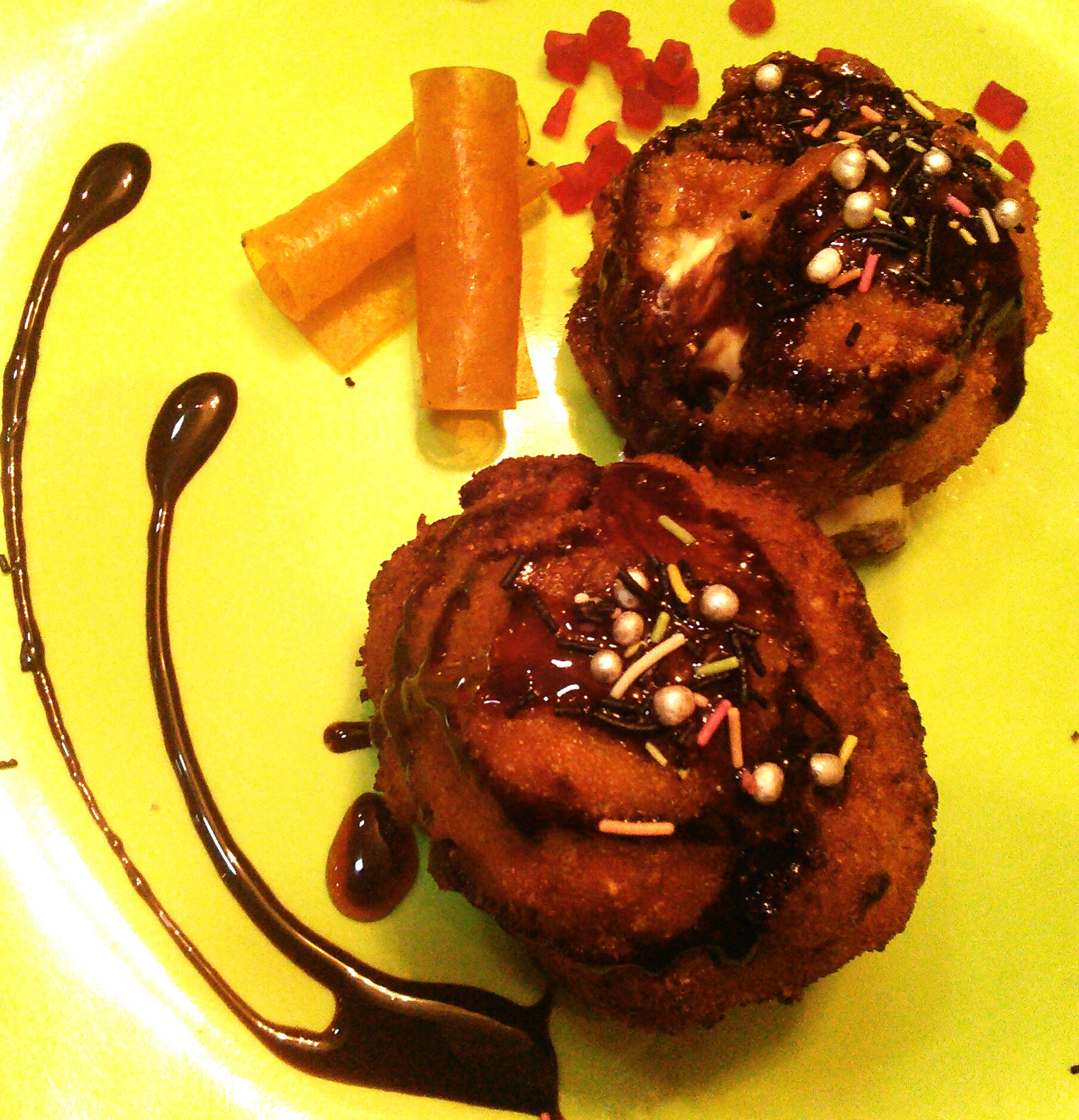 There are conflicting stories about the dessert’s origin. Some claim that it was first served during the 1893 Chicago World’s Fair, where the ice cream sundae was also invented.[1] Though in 1894 a Philadelphia company was given credit for its invention describing : “A small, solid cake of the [ice] cream is enveloped in a thin sheet of pie crust and then dipped into boiling lard or butter to cook the outside to a crisp. Served immediately, the ice cream is found to be as solidly frozen as it was first prepared.” A third claim, beginning in the 1960s asserts that fried ice cream was invented by Japanese tempura restaurants. – Wikipedia