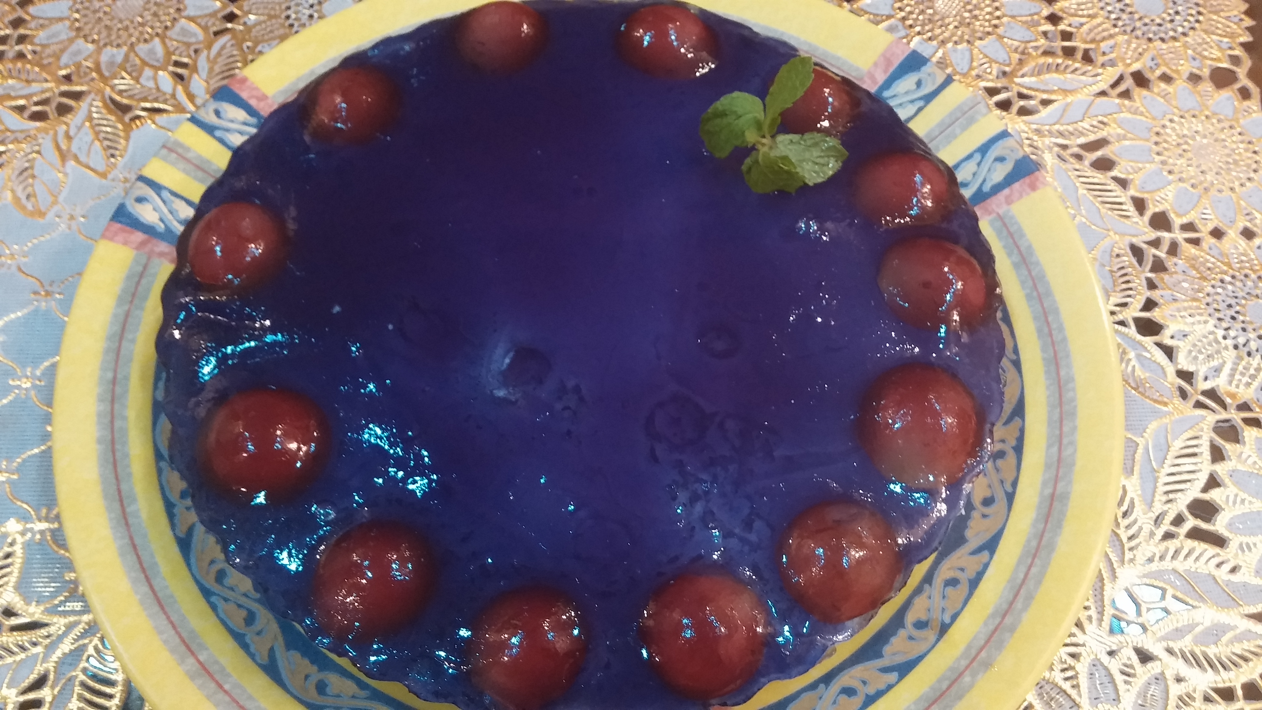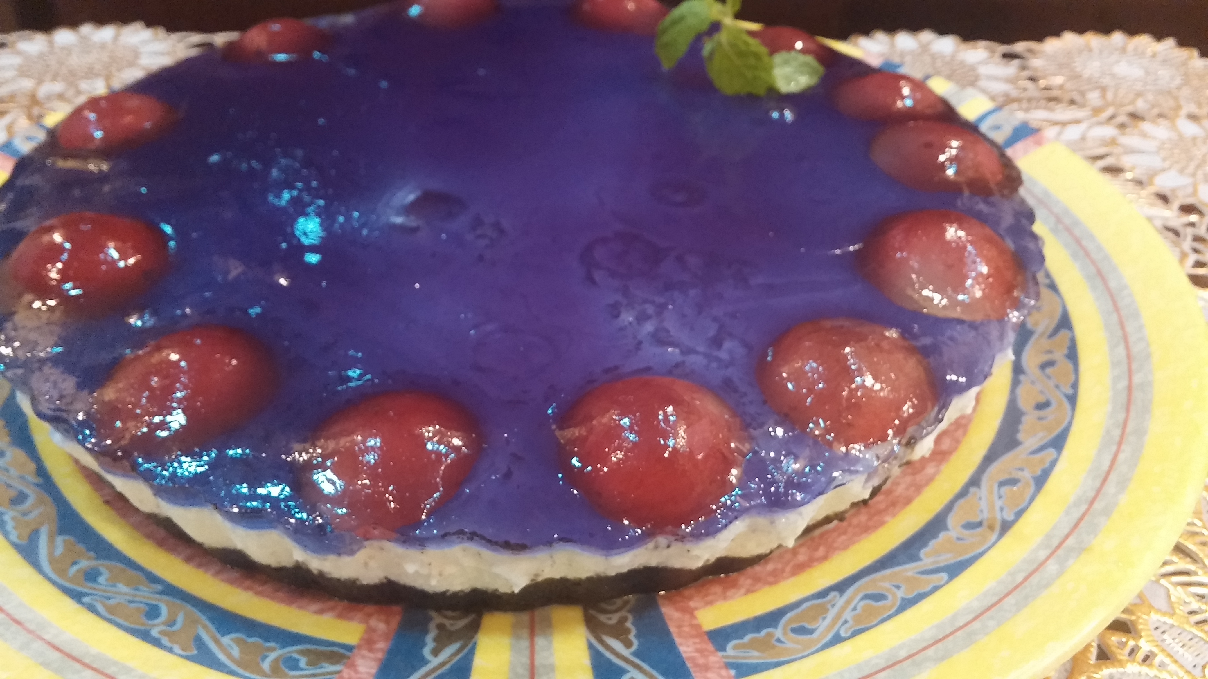 Decorate the cake with grapes. Prepare jelly as per packet instructions. Carefully spoon out while still hot onto the cheese cake. Chill in the fridge overnight or for atleast 4-6 hours to set.