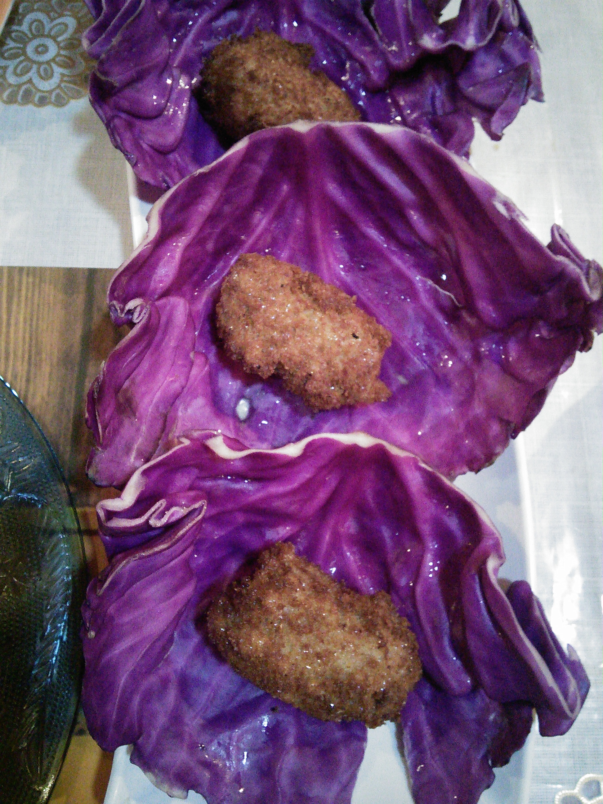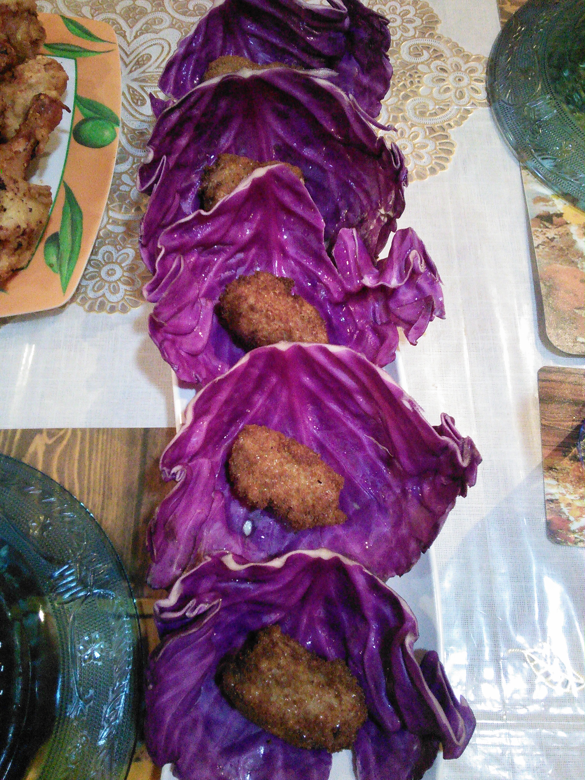 I’m not sure that I’m adventuresome enough to try this recipe, but the presentation is beautiful. I really like how the fritters look on the red cabbage leaves.