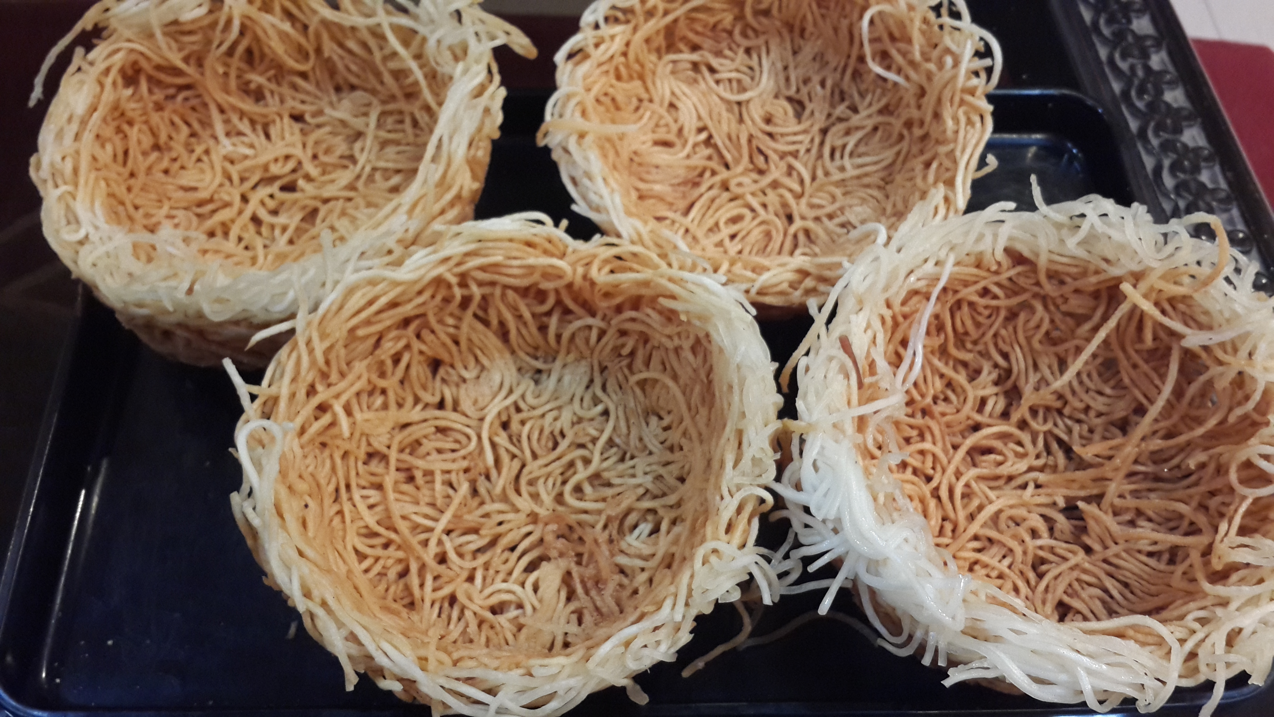 While I am busy with the fiesta, my kids are already excited about the Super bowl. And that means making lots of goodies and munchies for the weekend. but right now I am making Chinese basket Noodles with seasonal veggies and chicken. The vegetarians can leave the chicken and still make the dish. It tastes just as good. Since the baskets can get soggy, I am carrying them separately and spoon in the vegetables only when I am about to serve.