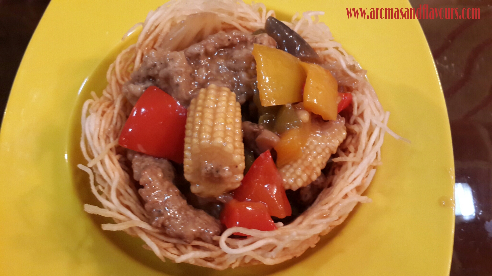 Heat oil in a wok. Place a portion of the noodles in a sieve/strainer to make a basket, along the mesh of the sieve.Place another sieve on top to hold the noodles in place. Put in hot oil and deep fry till golden brown in color. Remove from the sieve and keep aside on a paper towel. Basket is ready for use.