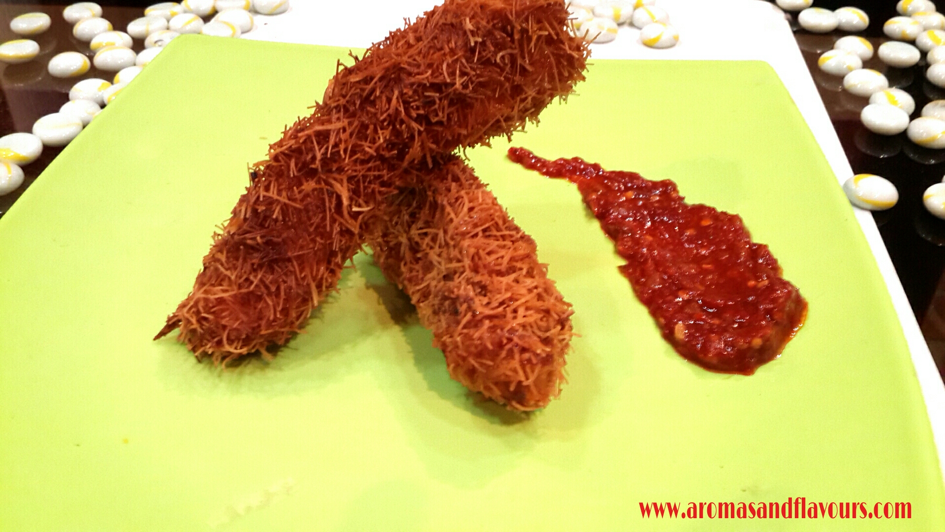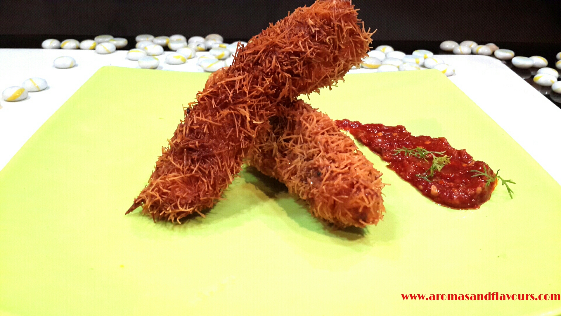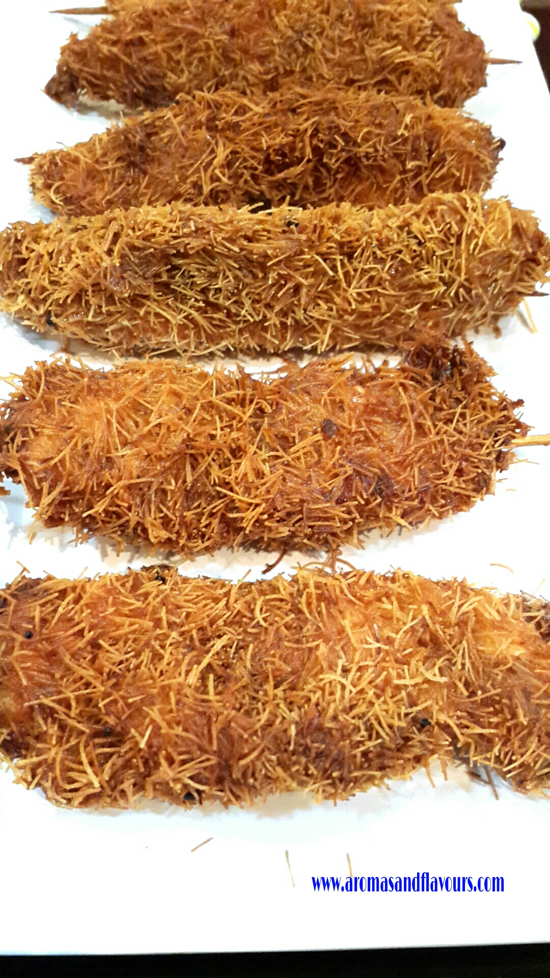 kataifi doughIf this is not available you can use thin roasted Vermicelli. The chicken strips are then deep fried. You can alternatively, brush them with some oil and bake them , What Ever 😉 you like. I like the fried version. It is much tastier. Crisp on the out side, juicy and tender inside.