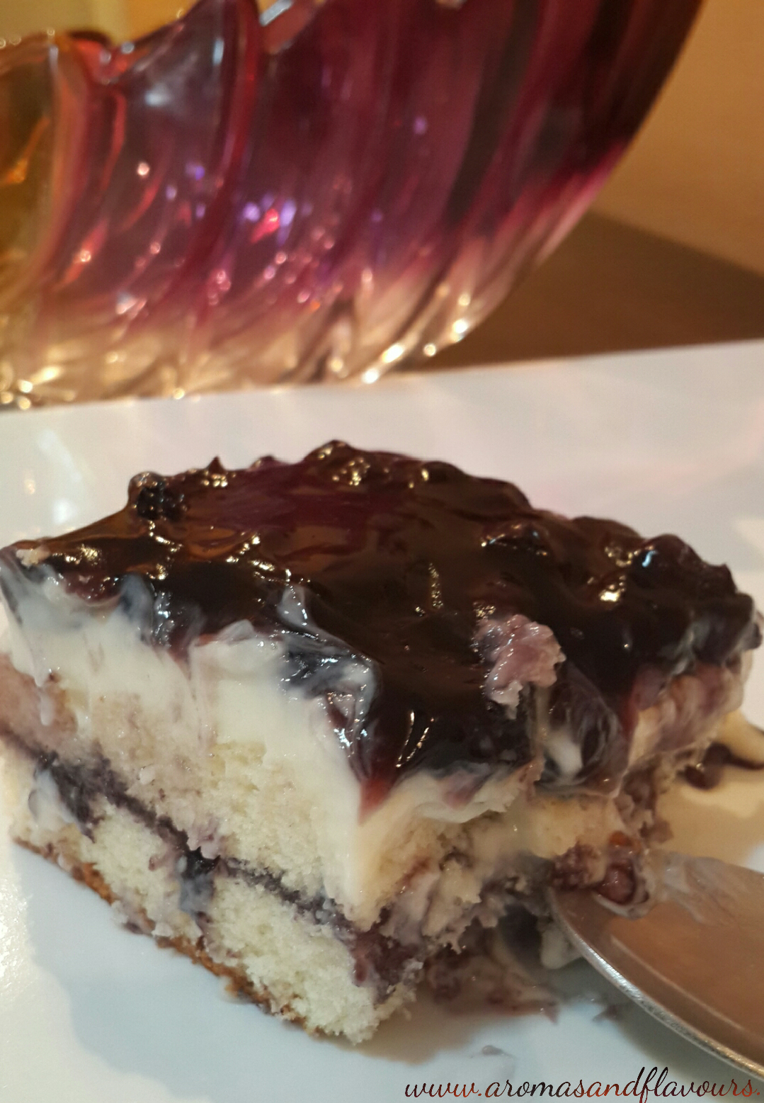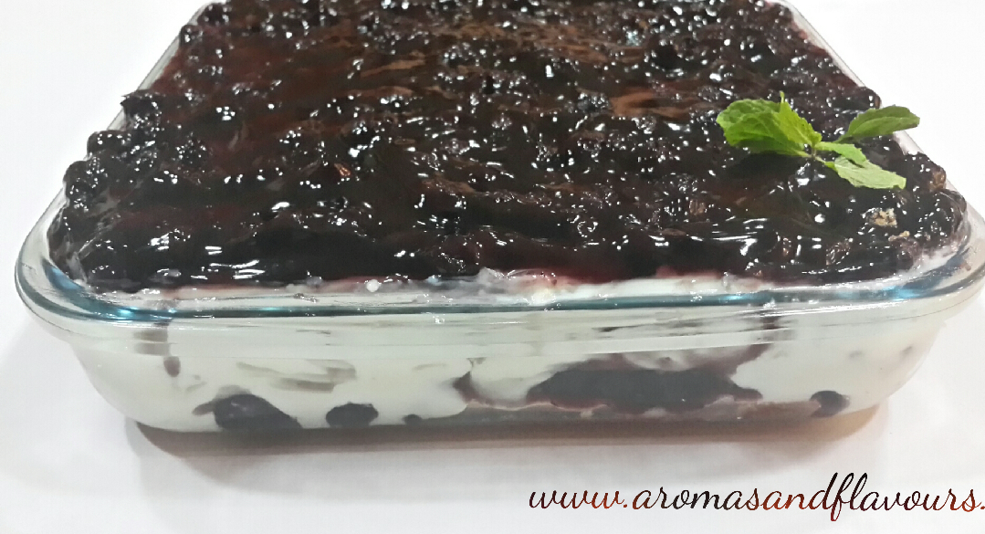 I don’t know if the words are a coincidence or coined on purpose,but I quite agree with the quote.When we are in a need to deflate our stress, gorging on a luscious dessert can really work wonders.Especially when it is made with juicy little berries…sugary and tart… bursting flavors in the mouth giving tiny blasts of ecstasy, layered with smooth creamy white custard and moist sponge cake chilled together . If this is not delightfully de stressing I wonder what else is. So take a deep long breath,slice a generous portion of this yummy dessert,sit back and enjoy.
