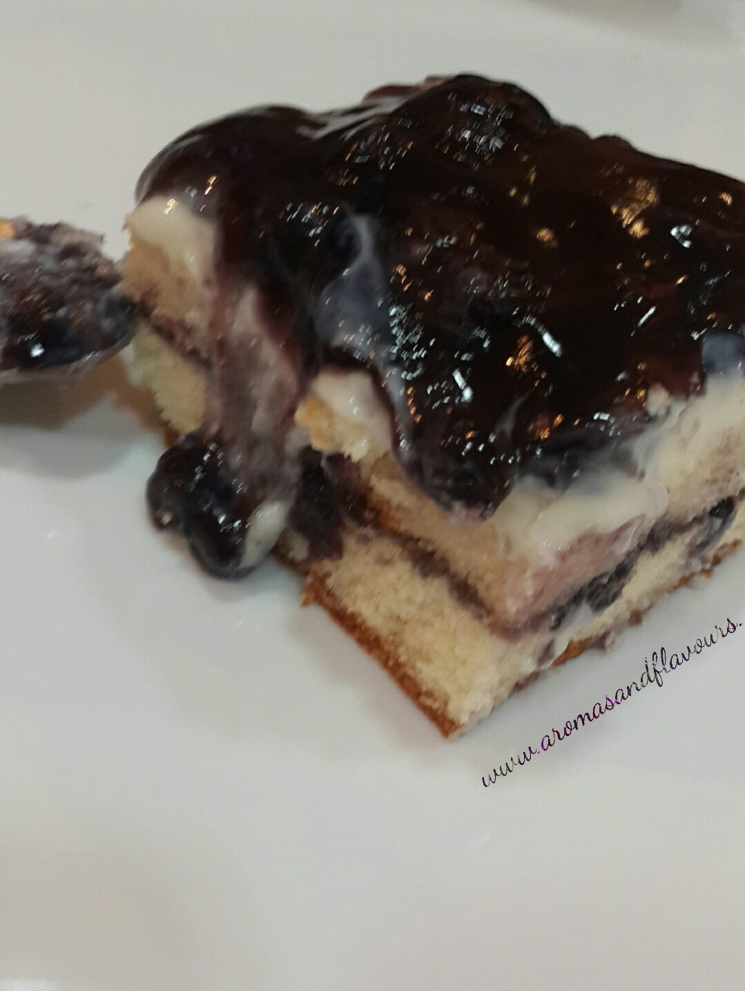 - Spread the blueberry pie filling over the cake in a thin layer.